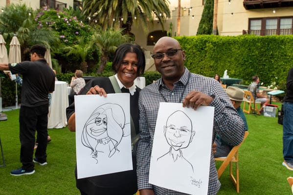 Two attendees of the 2023 Oasis Psychiatry Conference with their caricature drawings.